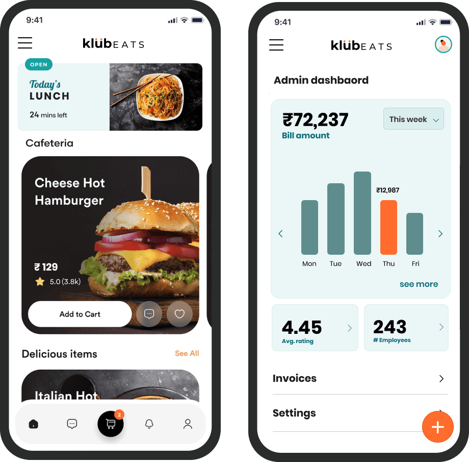 Employees will get updates on daily menu and can easily order via our app, while admins can efficiently manage expenses, pay invoices, and update employee details through a centralised dashboard- providing a seamless experience for all